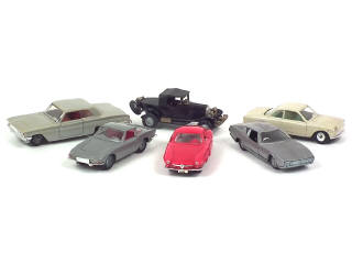 états de 'A' à 'B' - comprend : ALFA ROMEO GIULETTA SS, SIATA 1500TS, FIAT 501S, OLDSMOBILE F85 (état 'C', carrosserie plus ou moins décolorée & un phare manquant) & PIRANA BERTONE (manque 2 autocollants) - on y joint une CHEVROLET CORVETTE RONDINE de la marque MEBETOYS - 4 voitures de la série MICROMINIATURES - quelques petites annotations sur les planchers