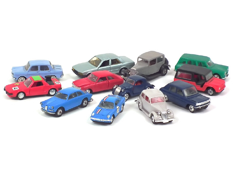 miniatures reproduisant les modèles : PEUGEOT (2 exemplaires différents dont un de la série JETCAR), CITROEN (3 exemplaires différents dont un avec plaque minéralogique incomplète), ALFA ROMEO, SIMCA (4 exemplaires différents dont un avec roue de secours & cache manquants, un autre avec fêlure sur le pare-brise), FIAT & RENAULT ALPINE (décalques ajoutés) - carrosseries plus ou moins déformées