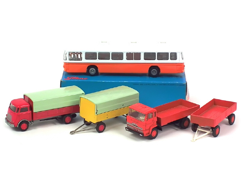 comprend : SCANIA CR 76 autocar (état 'A.c'), DAF plateau à ridellles avec remorque & plateau à ridelles bâché avec remorque bâchée (non conforme) - on y retrouve les marques : TEKNO DANEMARK (boîte 'HOLLAND') & LION CAR