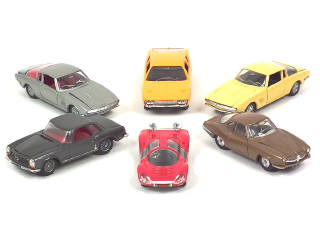comprend : LAMBORGHINI ESPADA, ALFA ROMEO GIULIA SS (quelques manques de pellicule chromée sur le pare-chocs avant, décalque de plaque minéralogique arrière incomplet), FERRARI DINO, MERCEDES 230 SL (état 'B', détails de peinture ajoutés) & FORD MUSTANG (2 exemplaires différents dont un en état 'B' avec petites fêlures sur le pare-brise & autocollant de plaque minéralogique incomplet)