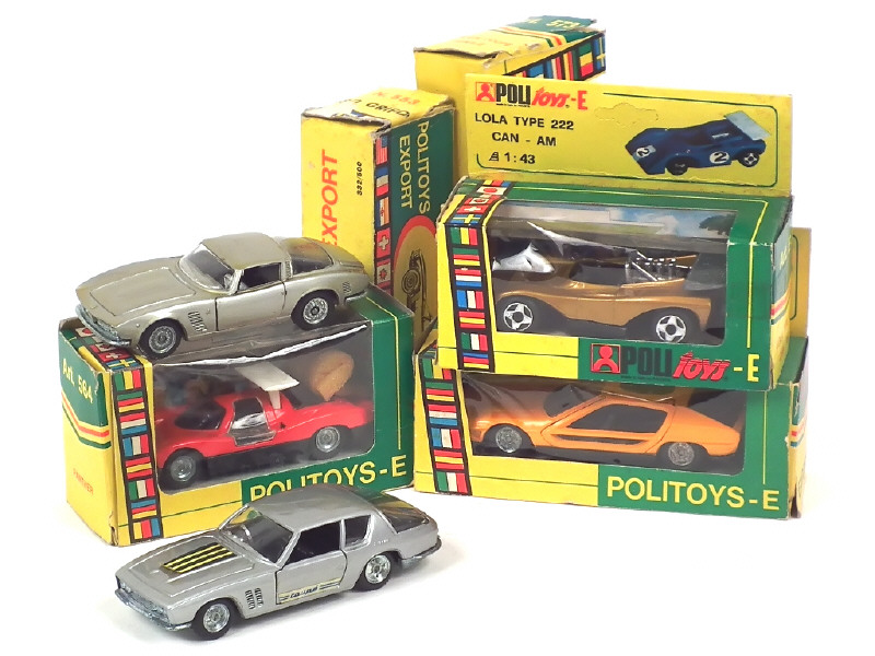 série 'EXPORT' - comprend : JENSEN VIGNALE coupé (boîte en état 'd'), ISO GRIFFO (traces de vernis d'origine sur l'ensemble de la carrosserie), LOLA 222 (boîte en état 'b' avec planche de décalques), LAMBORGHINI MARZAL & PANTHER (boîte en état 'd')