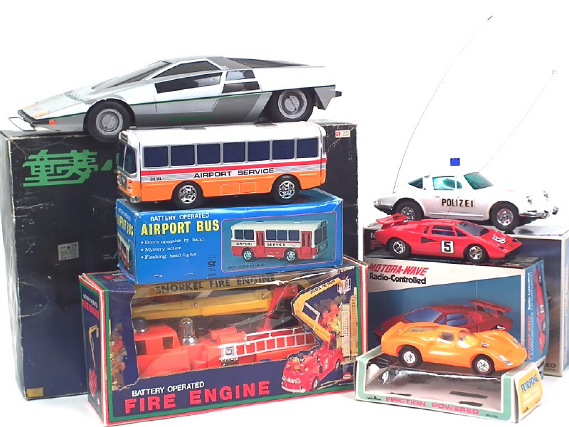 différentes échelles - comprend : DOME-O radiocommandée (échelle 1/12ème, avec accessoires & notice), PORSCHE 911S 'POLIZEI' radiocommandée (boîte en état 'b'), LAMBORGHINI COUNTACH radiocommandée (avec notice), un autocar 'AIRPORT SERVICE' (carrosserie encrassée), AMERICAN LA FRANCE grande échelle de pompiers & PORSCHE (moteur à friction fonctionne) - moteurs à piles non testés - on y retrouve les marques : MIC, NIKKO, TN, TAIYO & ALPS