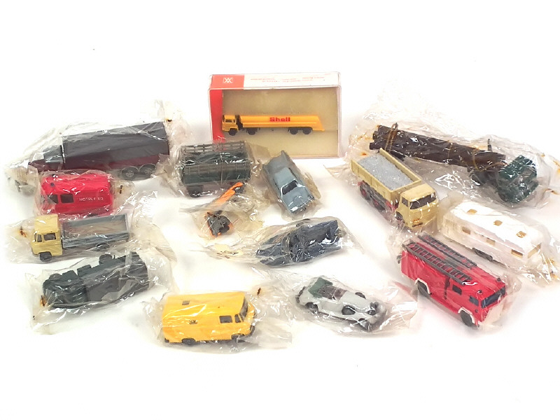 miniatures reproduisant notamment les modèles : MERCEDES, MAGIRUS, HANOMAG & FORD - sous sachet d'origine (dont certains jamais ouverts, agrafes oxydées) - on y joint un camion semi-remorque citerne 'SHELL' (état 'A.c') à l'échelle 1/60ème