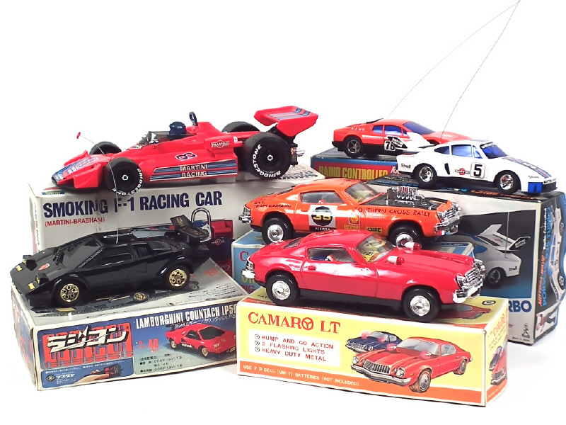 différentes échelles - comprend : BRABHAM MARTINI F-1 (moteur à piles non testé), CHEVROLET CAMARO (2 exemplaires avec moteur à piles non testés), FERRARI 512 BB (téléguidée non testée), LAMBORGHINI COUNTACH LP500S (téléguidée non testée) & PORSCHE 935 (téléguidée non testée) - on y retrouve les marques : ALPS, ASAHI, MODERN TOYS & TAIYO
