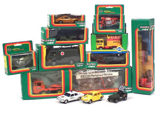 GAMA (ALLEMAGNE) Ensemble de 8 véhicules, 2 motos, un char, une remorque & un engin de travaux publics