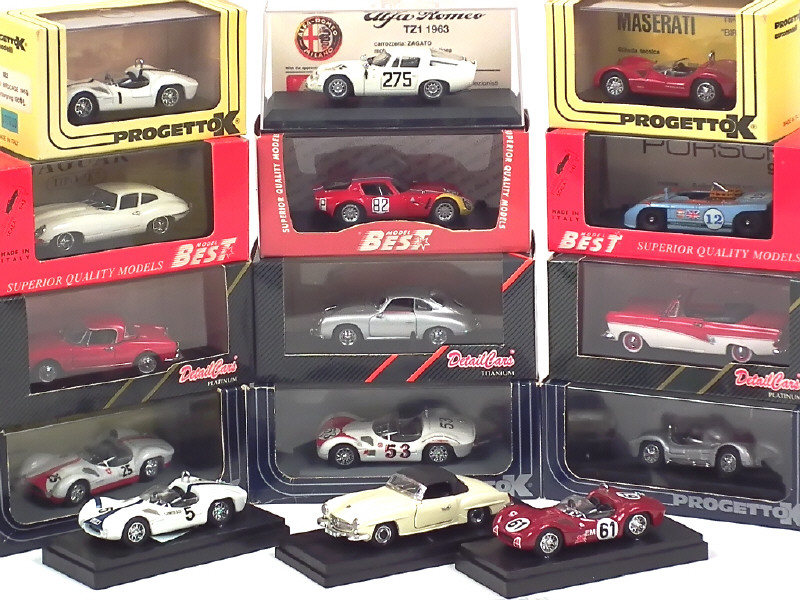 miniatures reproduisant les modèles : MASERATI (7 exemplaires différents, une boîte en état 'c'), JAGUAR, PORSCHE (2 exemplaires différents), ALFA ROMEO (3 exemplaires différents, un phare à refixer), MERCEDES & FORD - on y retrouve les marques : PROGETTOK, DETAILCARS, RIO & BEST MODEL
