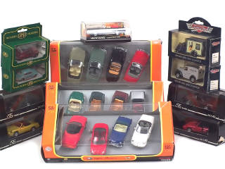 miniatures reproduisant les modèles : MERCEDES (4 exemplaires différents regroupés dans un coffret), ALFA ROMEO (2 exemplaires différents regroupés dans un coffret), MG (2 exemplaires différents regroupés dans un coffret), JAGUAR (2 exemplaires différents regroupés dans un coffret), BENTLEY (2 exemplaires différents regroupés dans un coffret), CITROEN, FORD, MORRIS & BEDFORD - on y retrouve les marques : NEW-RAY, ARS MODEL, LLEDO & CORGI TOYS - 4 boîtes en état 'c'