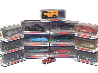 miniatures reproduisant les modèles : AUSTIN, MG (2 exemplaires différents), CITROEN (2 exemplaires différents), FORD (3 exemplaires différents), DELAHAYE, PORSCHE, CHEVROLET (2 exemplaires différents), JAGUAR, TUCKER - boîtes tachées dont 2 en état 'c'