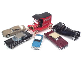 différentes échelles - comprend : STUDEBAKER AVANTI 1963 (une attache de train avant à refixer), BUGATTI ROYALE 1930, CADILLAC EL DORADO (2 exemplaires différents), NASH METROPOLITAN 1956 (un essuie-glaces manquant) & FORD T fourgonnette 'COCA COLA' - petits manques & parties cassées