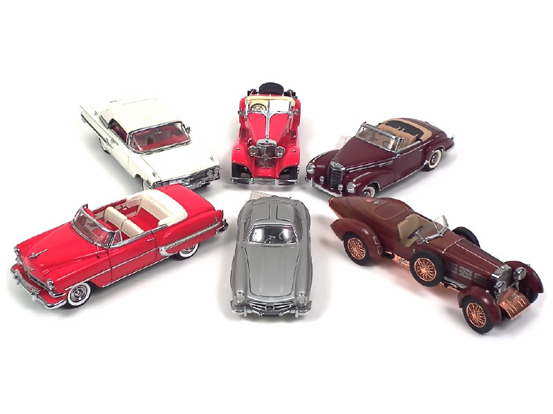 comprend : MERCEDES 300SL 1954, 300SC 1957, 500K 1935, CHEVROLET BEL AIR 1954 & HISPANO SUIZA 1924 - on y joint CHEVROLET IMPALA 1960 (pare-brise & une baguette latérale à refixer) de la marque DANBURY TOYS - petits manques & parties cassées