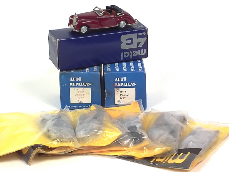 états de 'A+' à 'B' - comprend : TRIUMPH TR6, MORGANE coupé 1950, MERCEDES cabriolet, MASERATI 350S 1957, PORSCHE 550/RS4 1957, MASERATI 150S 155 & NARDI 1955 (2 exemplaires identiques) - 5 kits à monter (sous blister jamais ouvert) - 2 boîtes en état 'c' - on y retrouve les marques: WESTERN MODELS, AUTO REPLICAS & JOHN DAY MODELS
