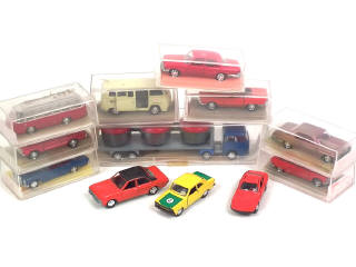 petites échelles - miniatures reproduisant notamment les modèles : MERCEDES, FORD, RENAULT, OPEL, VOLKSWAGEN (boîte en état 'c') & BUSSING - quelques parties nickelées ternies