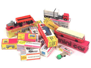 réalisations en plastique - différentes échelles - miniatures reproduisant notamment les modèles : IKARUS, UNIC, TATRA & SKODA - on y retrouve les marques : VEB, PLASTICART, MK MODELLE & PERMOT - 4 exemplaires au 1/180ème, 9 au 1/87ème & 3 au 1/120ème - quelques boîtes en état 'c' & 'd'