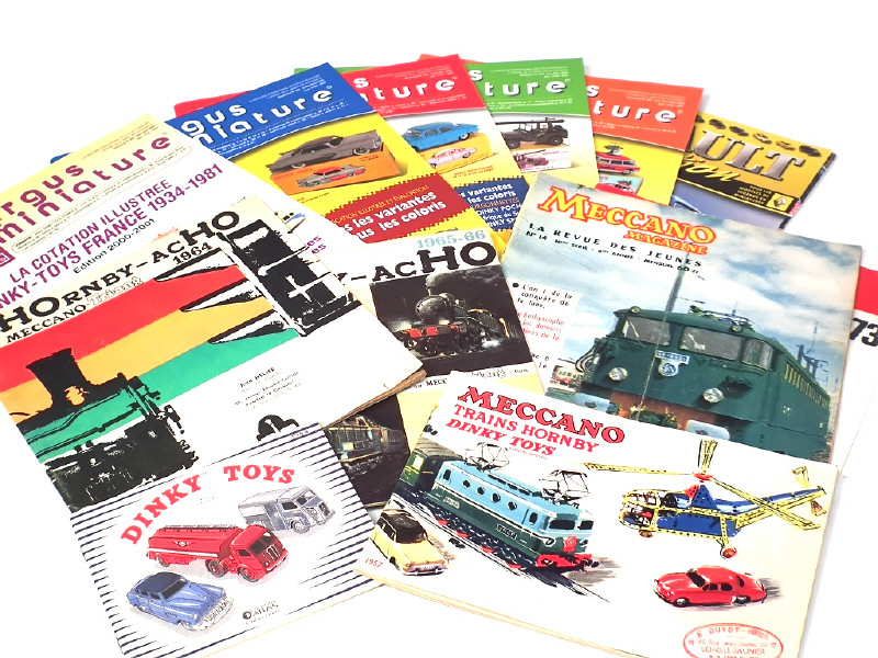 on y retrouve les marques : ARGUS DE LA MINIATURE, MECCANO MAGAZINE, RENAULT COLLECTION, HORNBY HO, MECCANO & EDITIONS ATLAS - quelques petites déchirures par endroits