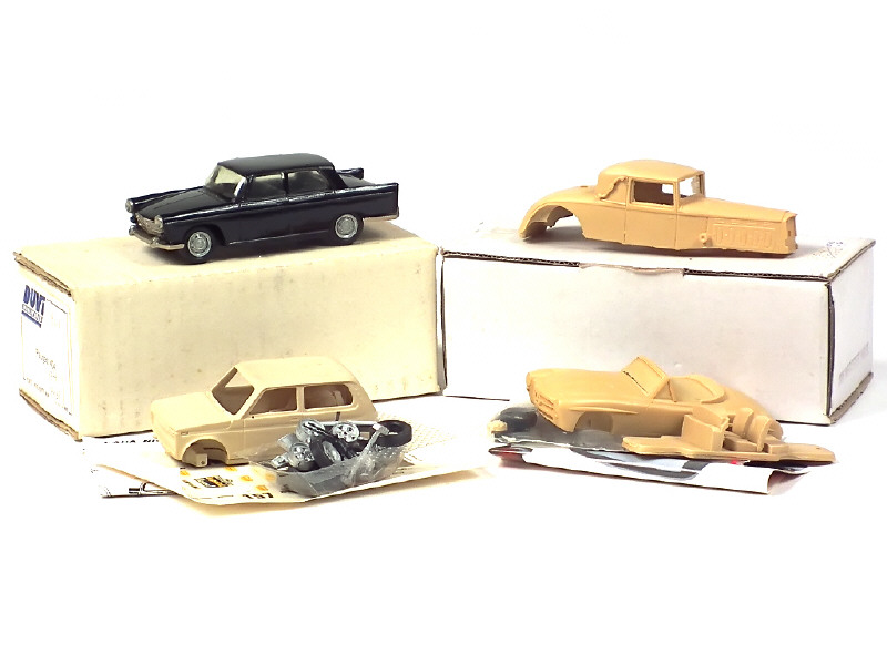 3 à monter - comprend : PEUGEOT 404 (montée), RENAULT REINASTELLA, (incomplet), LADA 4x4 (semble complet) & MERCEDES 190 SL - on y retrouve les marques : DUVI, PROCENCE MOULAGE, KAGERE EDITION & GAFFE