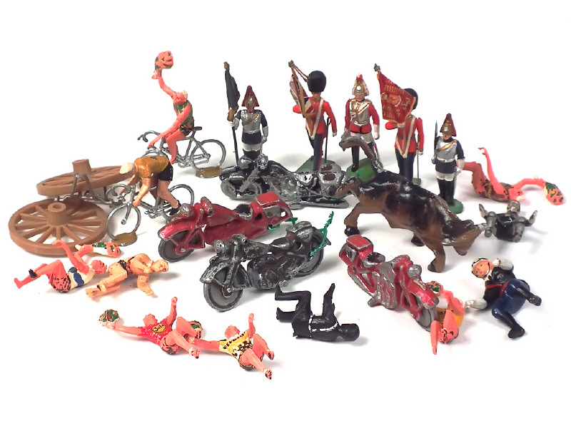 états de 'B' à 'F' - comprend : 4 motos, 3 motocyclistes, 8 coureurs cyclistes, 2 vélos, 5 soldats britanniques & un taureau - on y retrouve notamment les marques : BRITAINS & QUIRALU - on y joint 3 accessoires