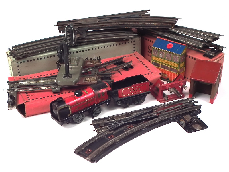 états de 'D' à 'R' - comprend : locomotive à vapeur type 020 avec tender mécanique (moteur à ressort fonctionne), différents rails, petit poste d'aiguillage en tôlr lithographiée, un feu de voie & butoir - parties repeintes - avec 3 boîtes (états 'c' à 'e')
