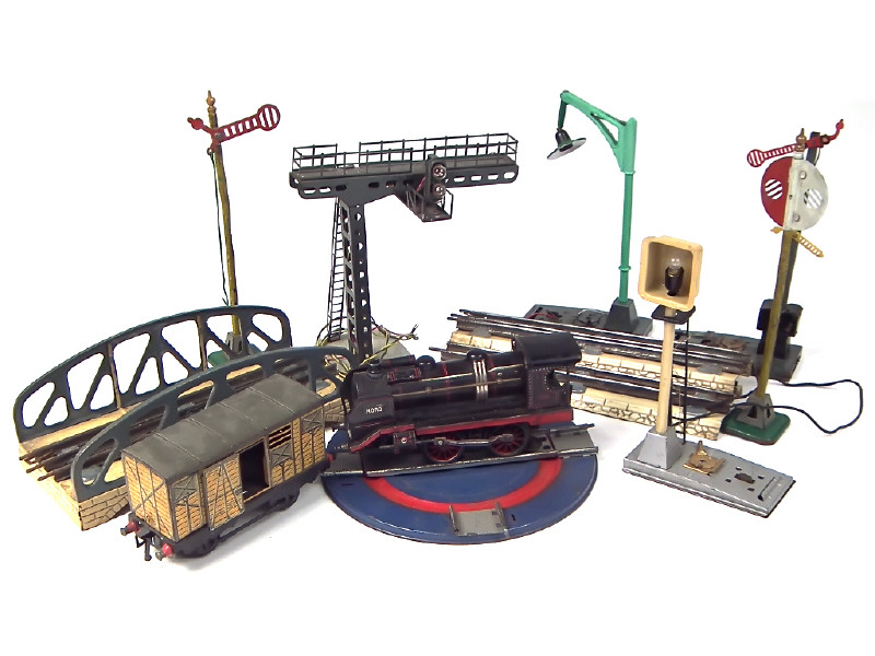 états de 'D' à 'R' - comprend notamment : locomotive à vapeur type 120 (non testée), wagon-fourgon, rails, pont, signaux & lampadaires - on y joint un plateau circulaire de marque HORNBY - parties transformées & retouchées