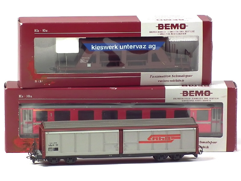 échelle : 1/87ème - comprend : voiture de voyageurs de première classe 'RHB', wagon-trémie 'UNTERVAZ' & fourgon de queue 'RHB' (électrifié & non testé) - très légers manques