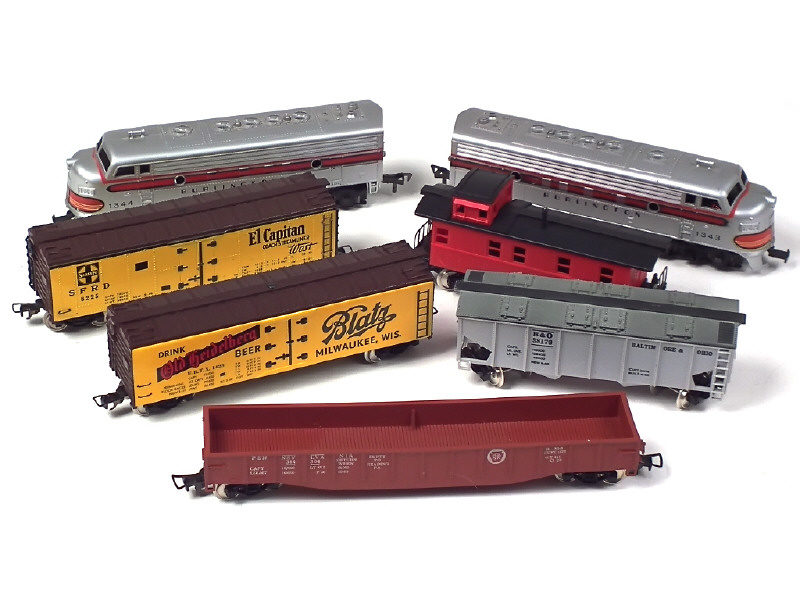 comprend : motrice-diesel 1343/44 à 2 éléments 'BURLINGTON' (non testée), 2 wagons-fourgon, trémie, tombereau & voiture de voyageurs