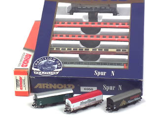 contient : motrice électrique type 110 236-7 (non testé), 3 voitures de voyageurs de 2ème classe & une voiture-restaurants - on y joint 3 wagons-fourgons différents (réunis dans un petit coffret)