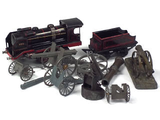 moteur à clef (à revoir) - avec manques, traces d'oxydation & parties repeintes - on y joint un lot de 7 canons & une charrette (notamment des marques S.R & SOLIDO) - avec manques & nombreuses parties cassées & repeintes