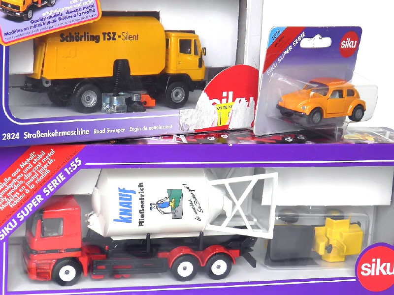 miniatures reproduisant les modèles : MERCEDES engin de nettoyage SCHÖRLING (petits manques de papier sur la boîte), MERCEDES ACTROS 2631 bétonnière (livré avec un dumper) & VOLKSWAGEN 1303 LS