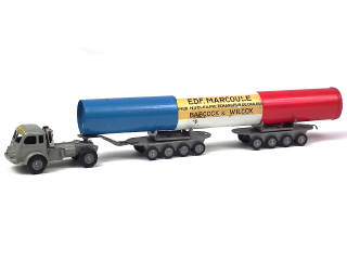 version avec décalque 'BOURGEY-MONTREUIL' sur le fronton de la cabine du tracteur & pile avec décalques 'BABCOCK & WILCOX MARCOULE' - le tracteur est en état 'B' (petits manques sur le décalque) - traces d'oxydation sur la pile (un petit enfoncement) & les remorques