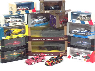 miniatures reproduisant notamment les modèles : AMX, BMW, PORSCHE, JAGUAR, LANCIA, Mc LAREN & FERRARI (dont un exemplaire avec détails de peinture ajoutés) - on y retrouve les marques : SOLIDO, RECORD, ONYX, BRUMM & MINICHAMPS - quelques boîtes en état 'c'