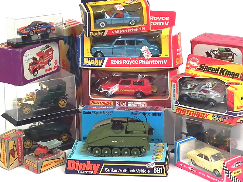 différentes échelles - on y retrouve les marques : DINKY TOYS GB, MATCHBOX, MEBETOYS, MIDGET TOYS, JOAL, EKO, FALLER HOOVER, NOREV & PILEN - quelques modèles en état 'B' - petits manques