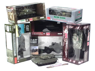 comprend : char SHERMAN M4 A3, JS 2, TIGRE II, ABRAMS M1 A, MERKAVA MK III, CATERPILLAR 140 H profiler & 980 G chargeuse sur pneus - on y retrouve les marques : HOBBYMASTER, NORSCOT & WARTANKS
