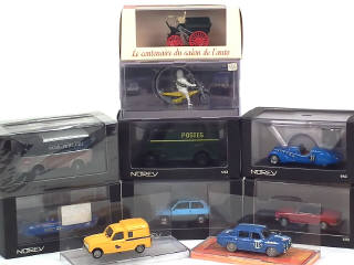 miniatures reproduisant les modèles : FIAT, DELAMARE, MOTOROUE 'MICHELIN', PEUGEOT (3 exemplaires différents) & RENAULT (4 exemplaires différents dont un sous blister jamais ouvert)