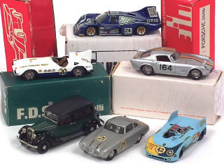 comprend : PORSCHE-AUDI 908, CARRERA (kit à monter, semble complet), MERCEDES, AUSTIN 16 YORK (sans boîte), RONDEAU M382, FERRARI 250 GT & 375 MM - on y retrouve notamment les marques : MRE, VARNEY, FDS, MRF & SILHOUETTE - avec manques - une boîte non d'origine