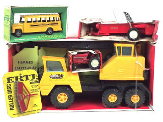 différentes échelles - comprend : camion-grue, autobus scolaire (un décalque endommagé), INTERNATIONAL tracteur agricole (état 'B'), INTERNATIONAL remorque agricole & brise-mottes (état 'A+' sous blister jamais ouvert - on y retrouve les marques : ERTL, HUBLEY & NYLINT