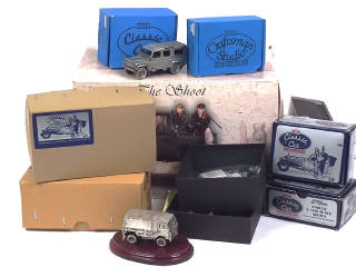différentes échelles - réalisations en étain - sur socles de présentation - on y joint LAND ROVER de la marque LESSER & PAVEY (2 exemplaires différents, réalisation en résine, sur socle de présentation, longueur 25 cm, avec figurines & éléments de décor, boîtes en états 'c'), une RANGE ROVER (boîte en état 'c'), un DEFENDER & série I (de marque indéterminée)