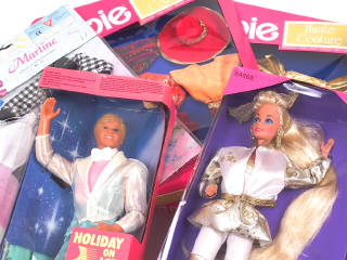comprend : BARBIE HOLLYWOOD, KEN HOLIDAY ON ICE, habillages : HAUTE COUTURE (2 exemplaires différents), de nuit, foulard, SUN SENSATION, DIFFUSION HABILLAGE & cintres (blister en état 'c') - 4 blisters jamais ouverts (quelques petits manques de papier) - on y joint des vêtements & bottes sous blister jamais ouvert 'MARTINE' de la marque MARKI