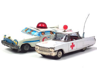 longueur : 16 cm - moteur à friction bruiteur & projecteur directionnel de toit (fonctionnent) - on y joint une ambulance en tôle lithographiée de la NE-KUR (parties chromées ternies)