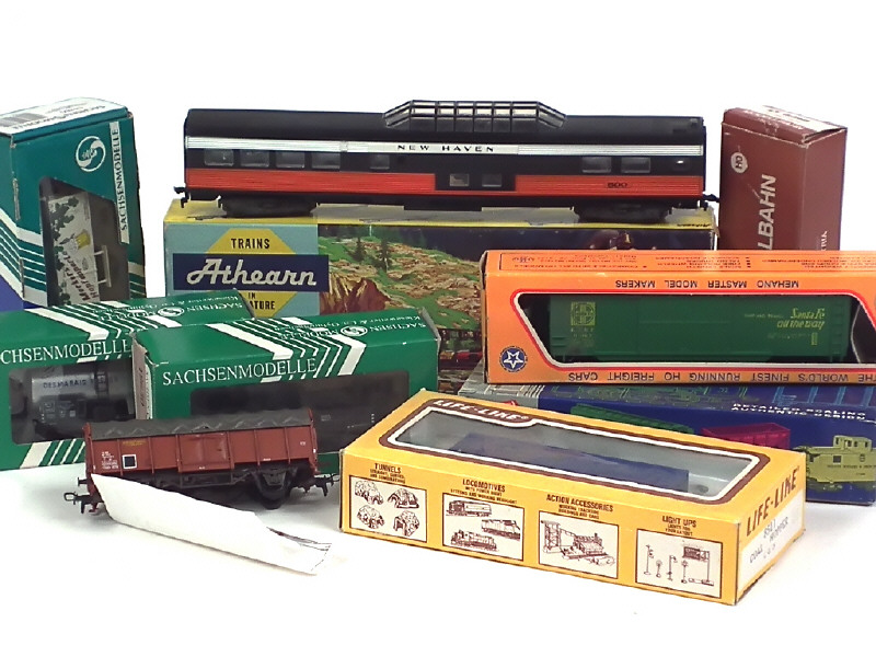 comprend : voitures de voyageurs 'NEW HEVEN' (traces d'humidité sur les supports de bogies, 2 wagons-trémies 'B&O' & 'L&N', tombereau-bâché, tombereau 'MT', 2 fourgons ('SANTA FE' & 'MERKERS') & citerne 'AZUR' - on y retrouve les marques : SACHSEN MODELLE, ROUND PRODUCTS, KLEIN, LIFE LIKE, ATHEARN & MEHANO - quelques petits manques