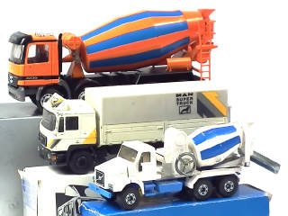 comprend : MERCEDES ACTROS 3235 bétonnière (état 'B.b' avec sachet de rétroviseurs), VOLVO N10 bétonnière (état 'B.c', carrosserie encrassée) & MAN 19.362F bâché (état 'D.e') - on y retrouve les marques : NZG, SIKU & CONRAD