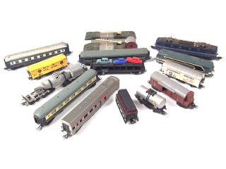 comprend : motrices électriques (2 exemplaires différents, non testées), voitures de voyageurs de la CIWL (5 exemplaires différents), fourgon à bagages & wagons de marchandises (10 exemplaires différents) - on y retrouve les marques : JOUEF & LIMA - avec petits manques - modèles encrassés - on y joint 2 transformateurs, un passage à niveau, un lot de rails (courbes & droits) & croisements