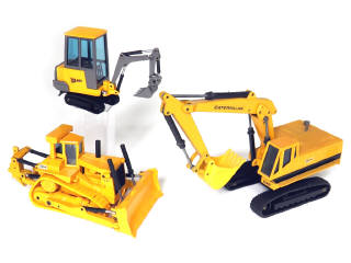 états de 'A' à 'B' - miniatures reproduisant les modèles : JCB 801, CATERPILLAR D10 & CATERPILLAR 225 - modèles légèrement poussiéreux