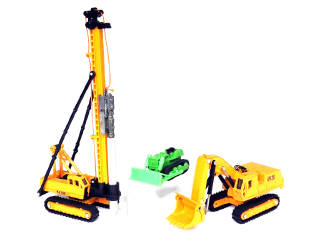 miniatures reproduisant les modèles : HITACHI KH180, HITACHI UH20 & un bulldozer (marque du fabricant de miniature inconnue)