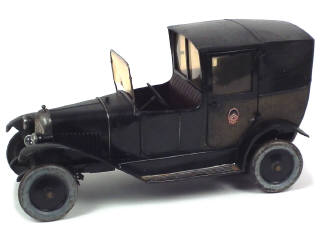 longueur 38 cm - fabrication de 1925-1927 - moteur à clef (fonctionne) - direction par le volant, phares électriques (à revoir) avec commande au tableau de bord & 2 portières ouvrantes - absence majeure de peinture sur les bandes de roulement des pneus - retouches plus ou moins importantes dont certaines très anciennes - quelques petits éléments non d'origine & d'autres manquants