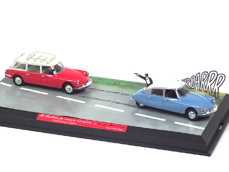 contient : CITROEN DS 19 PALLAS, ID 19, figurines & diorama - réalisation sur base RIO - sous boîte vitrine - série limitée numérotée 97/100 exemplaires