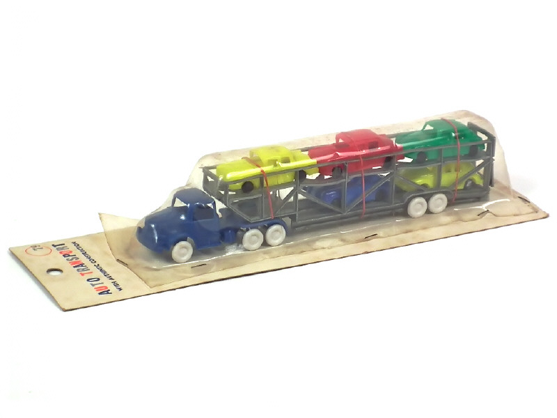réalisation en plastique - sous blister jamais ouvert (une petite déchirure) - contient : camion transport de voitures & 5 voitures dont notamment CITROEN, MERCEDES & PORSCHE - distribué par HENRY GORDY INC. (USA)