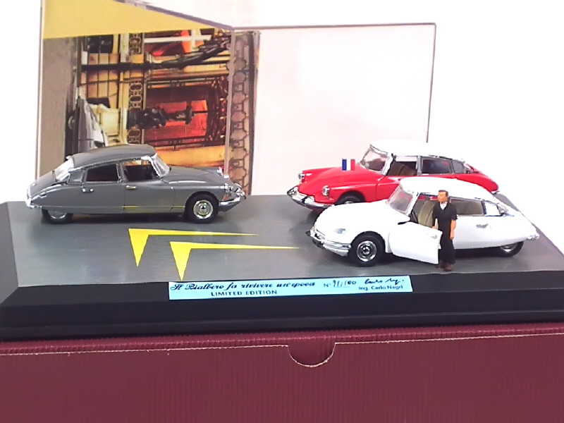 contient : 3 CITROEN DS différentes, figurine & diorama - réalisation sur base RIO - sous boîte vitrine & avec suremballage cartonné - série limitée numérotée 91/100 exemplaires