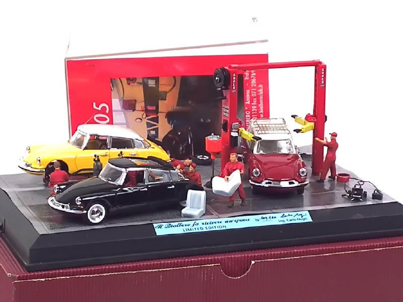 représente une scène de garage automobile - contient : 3 CITROEN DS différentes, figurines, accessoires, outils & diorama - réalisation sur base RIO - sous boîte vitrine & avec suremballage cartonné - série limitée numérotée 100/100 exemplaires