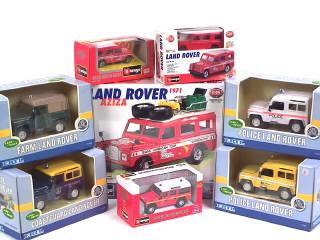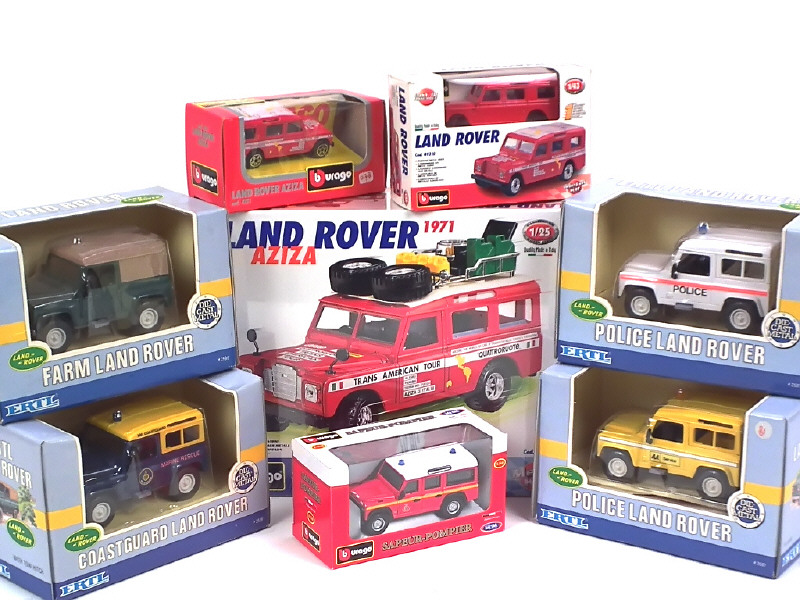 différentes échelles - comprend notamment : POLICE, MARINE RESCUE, AA SERVICE (2 exemplaires identiques dont un avec boîte en état 'c'), NORTH WALES LAND ROVER CLUB (boîte en état 'c'), AZIZA (4 exemplaires différents dont un avec boîte en état 'c' & un rétroviseur cassé, 2 kits à monter dont un sous blister jamais ouvert) - on y retrouve les marques : ERTL & BBURAGO