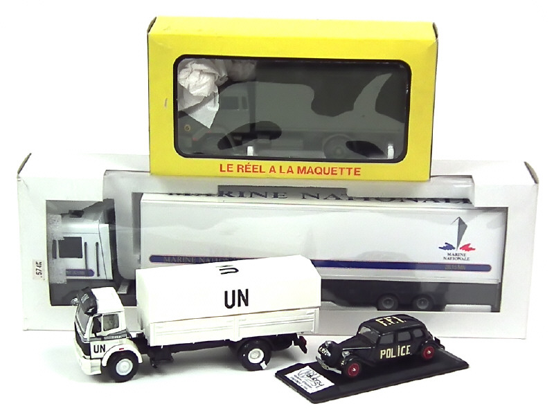 comprend : MERCEDES 1417 plateau à ridelles bâché 'UN', RENAULT TURBO camion-fourgon militaire (boîte en état 'c'), RENAULT AE 380 MAGNUM semi-remorque fourgon 'MARINE NATIONALE' & CITROEN 11B (décalques ajoutés, boîte non conforme) - on y retrouve les marques : NZG, LBS & DUBRAY
