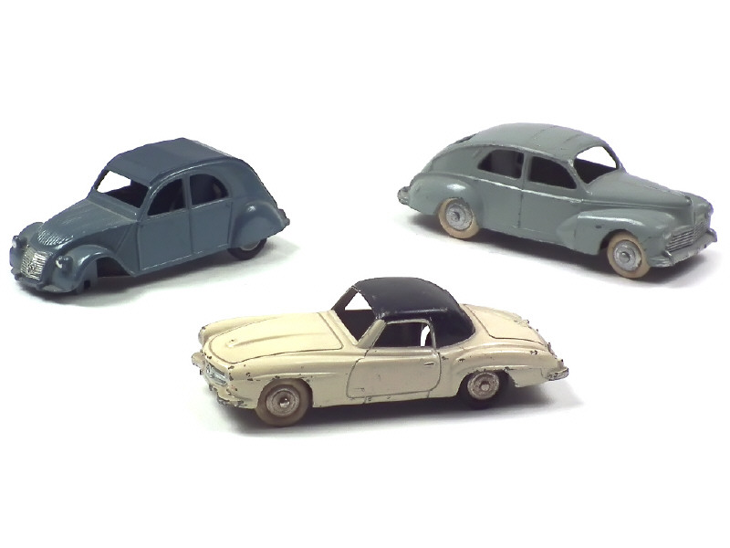 comprend : PEUGEOT 203 (jantes repeintes & plancher vernis), CITROEN 2CV (état 'C', version avec jantes concaves, manque 2 roues & un axe) & MERCEDES 190SL